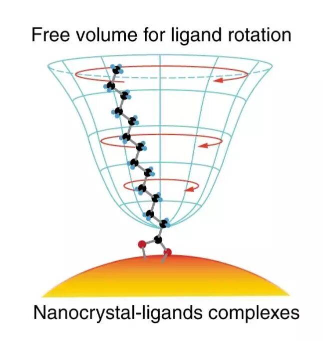 再从动态视角,科学家们发现,这些配体并不是固定的,而是在锥面往复运动,其运动的幅度可以定量测定。“我们发现混合配体的运动幅度明显大于单一配体,”孔学谦说,“这也许就是由于长短配体的分隔排列,让配体末端有了更大的自由度”。有了这些运动更加“奔放”的混合配体,量子点也变得更加容易溶解。