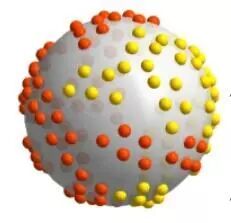 通过固体核磁技术,研究团队从静态和动态两个角度给出了解释。首先是静态视角,配体在量子点表面的排列分布既不是随机分布,也不是各站一边,而是呈片状集中分布,类似于由多边形拼合而成的足球(如下图)。