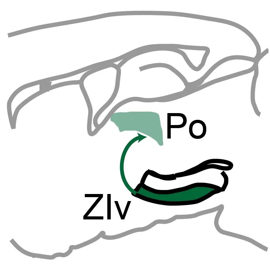 然而,ZIv内的PV阳性神经元并不是信息到达大脑皮层前的“最后一站”。科学家更为关心的是,它的下游核团在哪里,它们如何连接,最终如何完成痛觉信息传递?利用顺向病毒追踪的方法,研究人员成功找到了有效的下游核团——丘脑后核群(Posterior complex of the thalamus, Po),它是丘脑内重要的核团之一,参与调节疼痛。