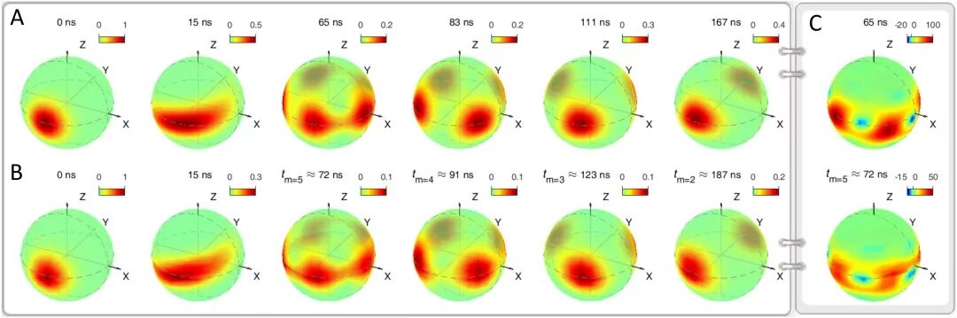 图:在实验控制条件下,20个人造原子集体从零时刻起跑后的相干演化动态过程的捕捉。不到200纳秒的过程中,人造原子的集体状态历经多次变身,在不同时间点出现有不同组份数(对应球中红色圈的数量)的薛定谔猫态,最终形成2组份(同时存在两种相反状态)的薛定谔猫态。A和B图分别为理论预测和实验观察结果。C图为根据建议在新视角下对5组份薛定谔猫态的重新描绘,球中蓝色区域的出现更有力地证明了量子纠缠的存在。