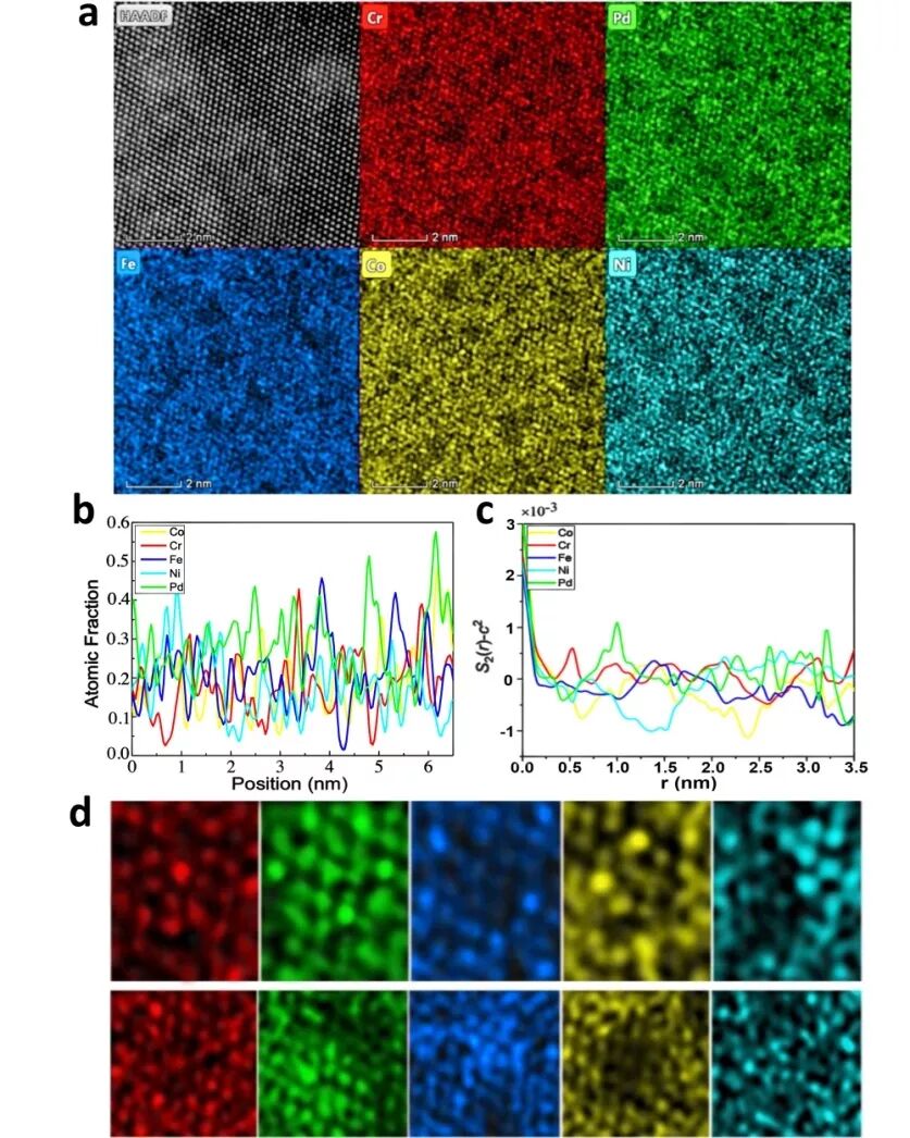 这种浓度震荡意味着什么?能否把震荡“放大”来研究?研究团队提出,“浓度波”将是研究高熵合金性能的特有的突破点。于是,他们创造性地将CrMnFeCoNi合金中的锰替换为钯。余倩解释,CrMnFeCoNi合金的组成元素在元素周期表上都为邻近元素,它们的电负性、原子半径、原子序数等差异不大,很难对其进行进一步辨别,而“个头”相对较大的钯,将改变原有的元素分布格局,让科学家更容易观察到其中的分布变化。